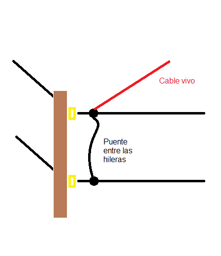 Entonces enviamos el cable vivo hacia una de las hileras, debemos puentearlas para electrificar a ambas, el puente se puede hacer en cualquier parte del recorrido aunque se recomienda realizarlo cerca de donde se empalma el cable vivo así de esta forma la energía es redistribuida uniformemente desde la salida del equipo.